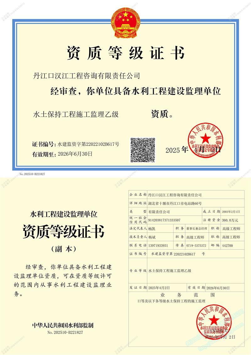 (原漢江綜合開發(fā)公司水利水電監(jiān)理中心)成立于 1989年3月,1993年6月經(jīng)水利部審批成為首批注冊監(jiān)理單位 (隸屬于長江水利委員會(huì)), 注冊資本 360萬元 。公司位于湖北省十堰市丹江口市電站路。公司目前擁有水利部頒發(fā)的 水利工程施工監(jiān)理甲級 、 水土保持工程施工監(jiān)理 乙 級 資質(zhì) ;住建部頒發(fā)的 房屋建筑 、 市政公用工程監(jiān)理 乙 級資質(zhì) 。 可獨(dú)立承擔(dān) 各類水利水電工程 、 一般工業(yè)與民用建筑工程監(jiān)理 , 土地整治 , 招標(biāo)代理 、 技術(shù)咨詢 等業(yè)務(wù)。公司實(shí)行董事會(huì)領(lǐng)導(dǎo)下的總經(jīng)理負(fù)責(zé)制,下設(shè)辦公室、經(jīng)營部、財(cái)務(wù)部、工程技術(shù)部等職能部門。……